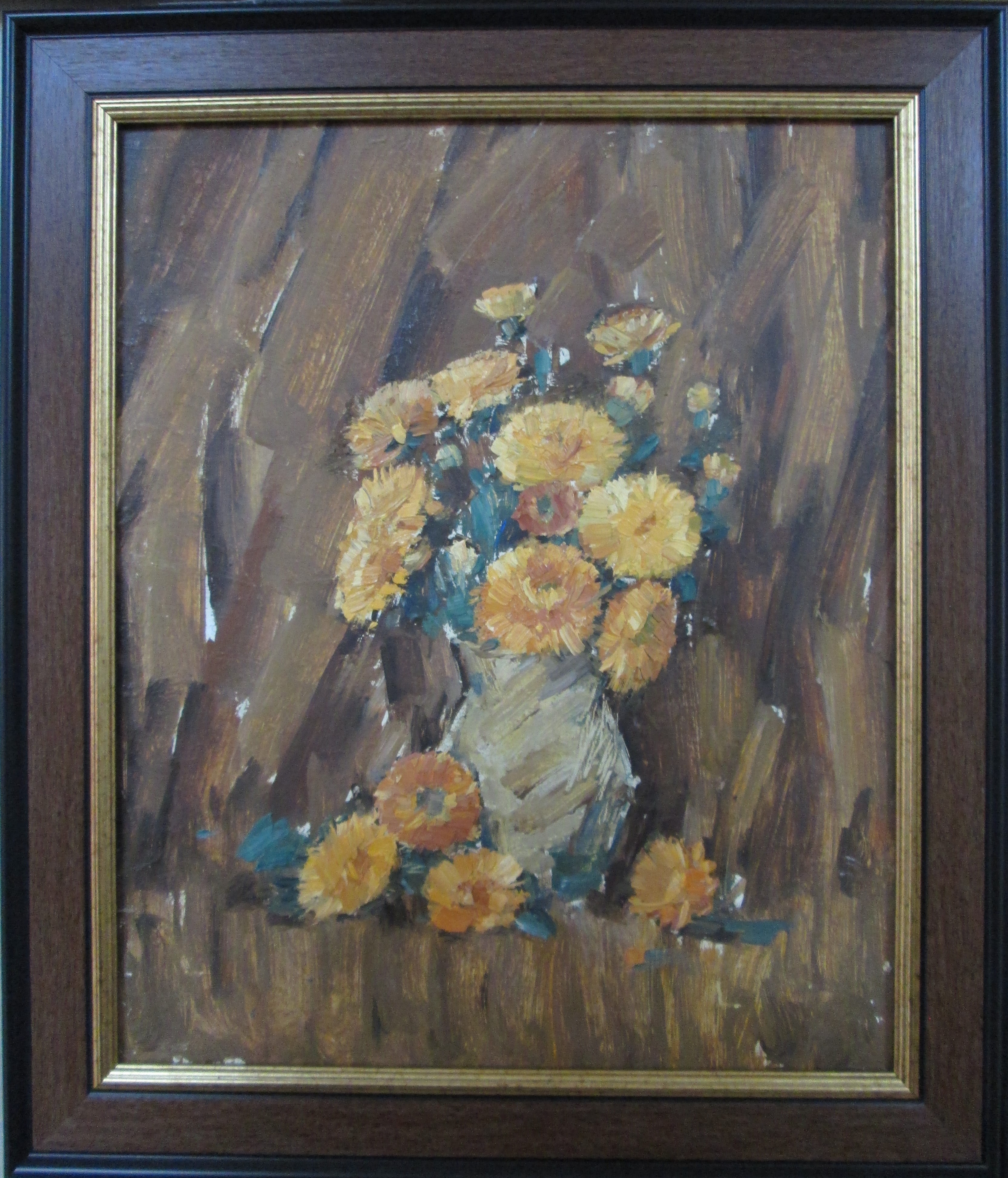 Lucrarea Crizanteme apartine pictorului Apostoloiu Victor.